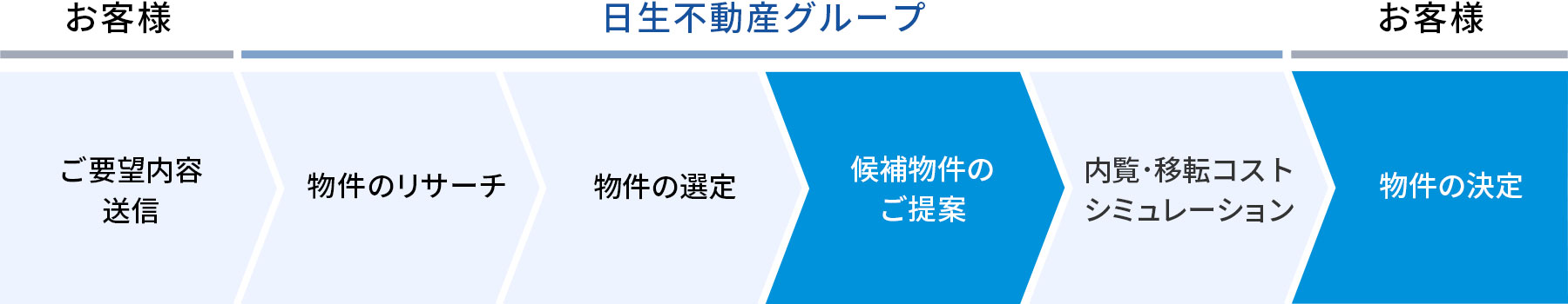 ご依頼後、グループ会社連携の基、専任スタッフが豊富な経験と確かな視点で、物件選定の段階から建物特性や設備をチェック。さらに賃貸コストシミュレーションによるご提案まで、広くサポートいたします。