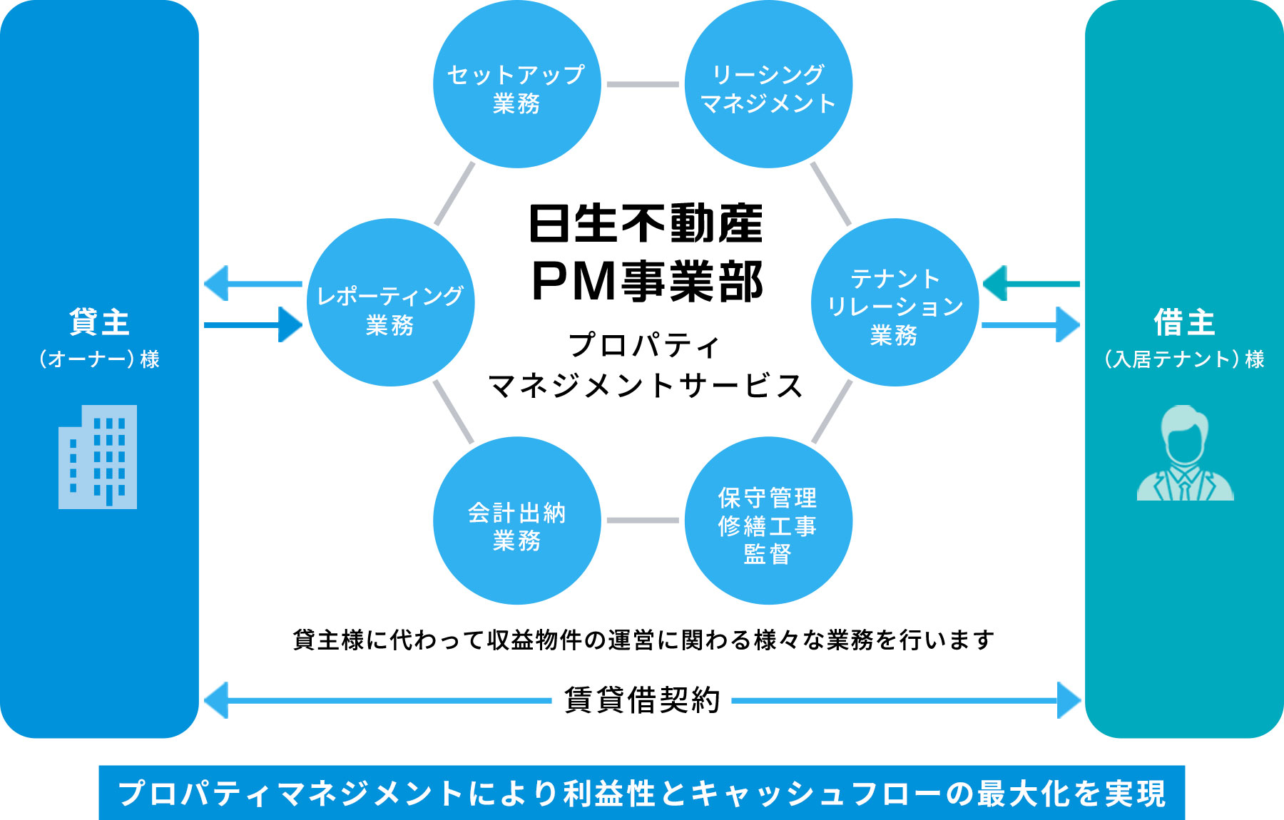 日生不動産グループ各種専門事業部の経験・実績をプロパティマネジメントに融合させることで、より質の高いサービスをワンストップでオーナー様にご提供いたします。