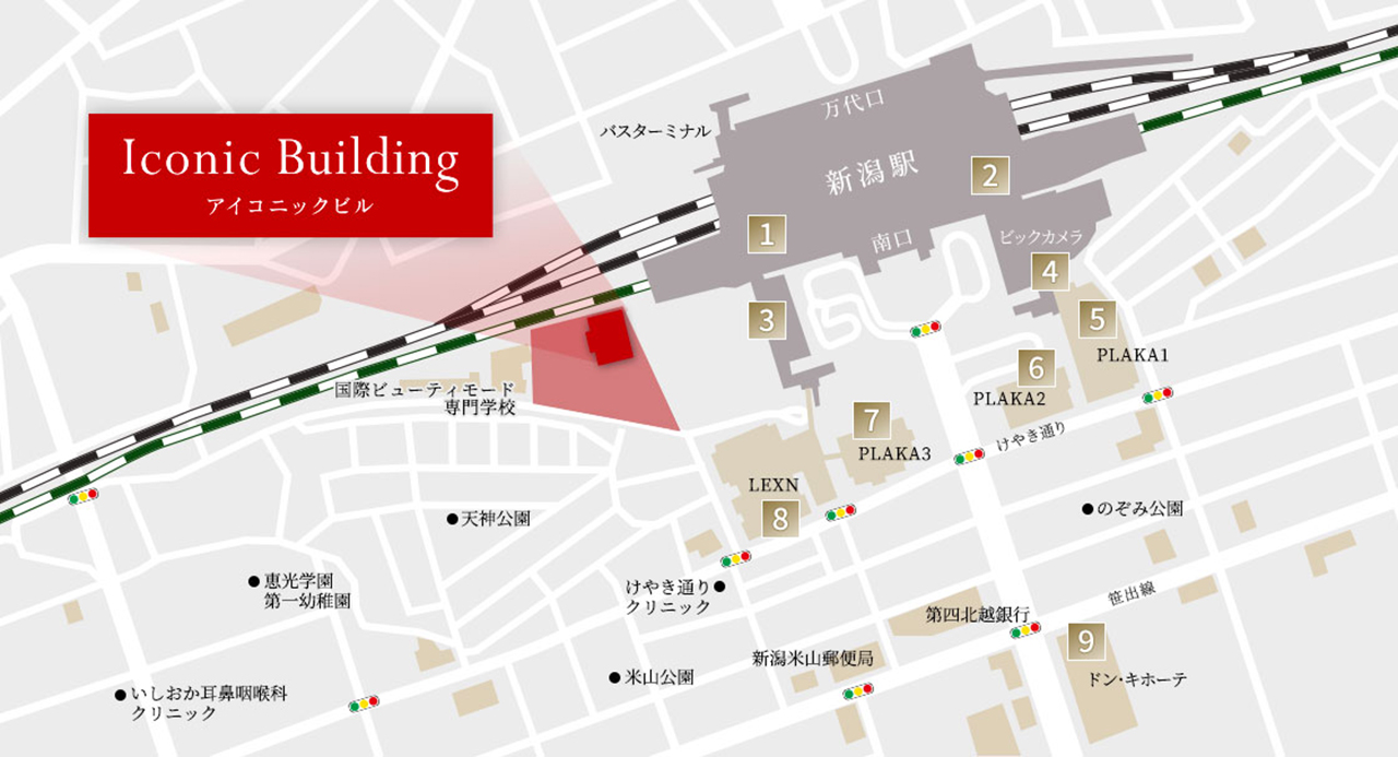 アイコニックビル周辺には、ホテルやコインパーキングが集積。新潟駅南口エリアでの集客率を強力にサポートします。
