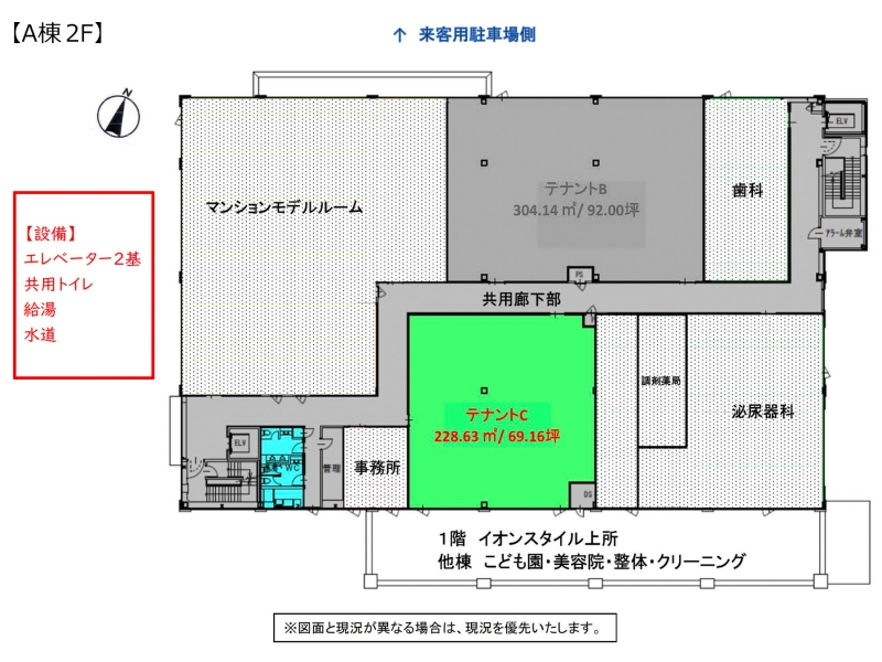 | 備考 | 来客用QR発券機:3,000円/月(税別) ※営業可能時間:8:00~23:00までです。 契約形態:定期賃貸借契約(当初契約期間;30年)※契約開始10年から解約可 引渡条件:現況(スケルトン)※内装工事は借主様にて行っていただきます。 ・当社指定の家賃保証会社にご加入頂く場合がございます。 初回保証料:賃料の1.5ヶ月分 / 更新料 賃料の10%(1年毎) ・セキュリティはテナントにてご用意ください。 ・光熱水費、塵芥処理費、消耗品費、設備点検費等は借主負担となります。 ・商業施設内に入居中のテナントと同業種はご相談。 |